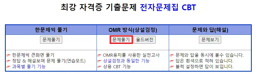 3. OMR 방식(상설검정) 문제 풀기를 클릭합니다.